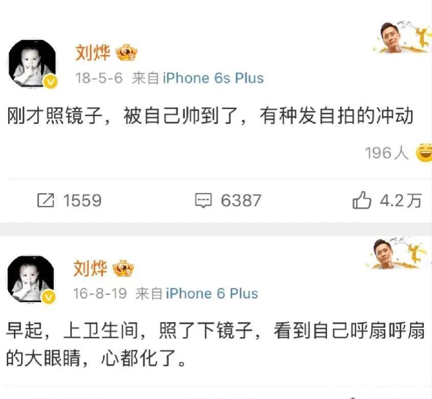 还有一次,他写下这样的博文:“上卫生间,照了一下镜子,看到自己忽闪忽闪的眼睛,心都化了”。换做一般人如此自恋,网友们可能早就上去嘲讽一番了,但对于刘烨,大家却只能点个赞然后离去。